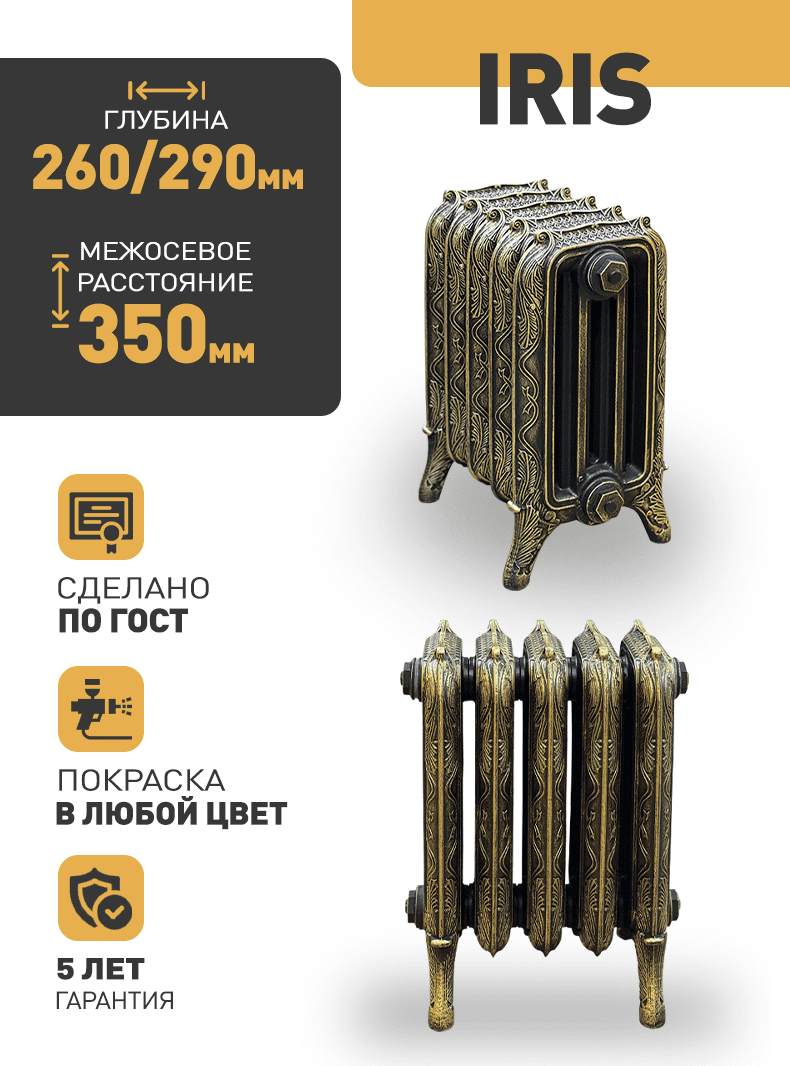 Чугун высокой плотности накапливает тепло и долго отдаёт его без скачков температуры. Корпус устойчив к коррозии, а художественный рельеф превращает прибор в декоративный элемент, выгодно отличающий IRIS от гладких панельных радиаторов.